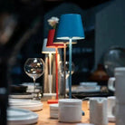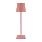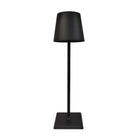 Denne bordlampe har et indbygget genopladeligt batteri og LED-belysning. Den er udstyret med en touch-følsom kontrol til at skifte lysstyrkeniveauer. Lampen har en konisk skærm, en høj lige stang og en flad firkantet base til bordplacering.